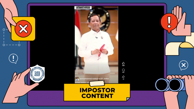 • Unggahan yang berisi video Mahfud MD berbagi bantuan dana merupakan kategori konten tiruan (imposter content).