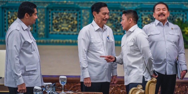 Menteri Sekretaris Kabinet Letkol Teddy Indra Wijaya tengah bercengkerama dengan Ketua Dewan Ekonomi Nasional (DEN) Luhut Binsar Pandjaitan sembari menunjuk Menteri Perumahan dan Kawasan Permukiman (PKP) Maruarar Sirait di sela-sela Sidang Kabinet Paripurna yang digelar di Istana Negara pada Senin, 15 Desember 2025. Turut tampak Jaksa Agung ST Burhanuddin di belakang Letkol Teddy. (Foto: Setkab RI)