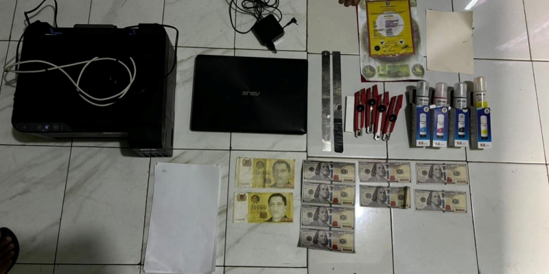 Dari tangan HS, petugas menyita 1.934 lembar Dolar AS dan 529 lembar Dolar Singapura, termasuk sejumlah lembar yang belum dipotong. Polisi juga mengamankan sejumlah barang bukti lain, seperti tas, telepon genggam, laptop, printer, tinta printer, dan peralatan lain yang digunakan untuk mencetak uang palsu.