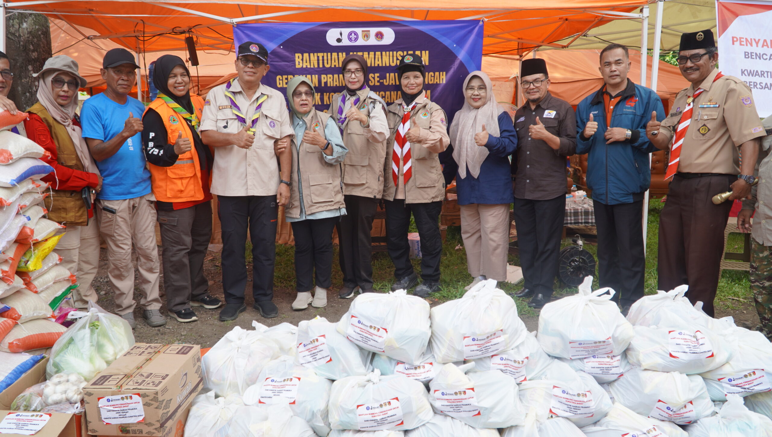 Di lokasi tersebut, Ketua Kwarda Gerakan Pramuka Jawa Tengah, Prof. Dr. Ir. Slamet Budi Prayitno, M.Sc., menyerahkan bantuan berupa paket sembako untuk 61 kepala keluarga serta bantuan uang tunai yang diperuntukkan bagi Kwartir Cabang Gerakan Pramuka Kabupaten Agam. Bantuan ini diharapkan dapat membantu meringankan kebutuhan dasar masyarakat terdampak bencana.