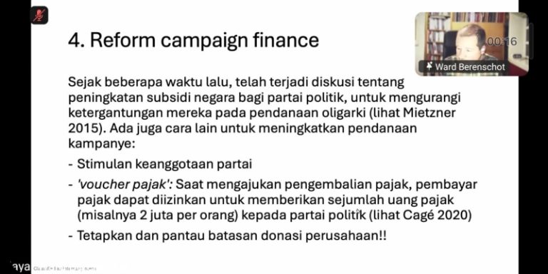 “Akan ada accountability, setiap tahun ada seperti pemilihan. Ada accountability demokrasi lewat voucher pajak ini. Akibat juga ada insentif untuk parpol untuk bekerja dengan baik. Karena kalau tidak, anggaran akan turun drastis,” demikian Ward.