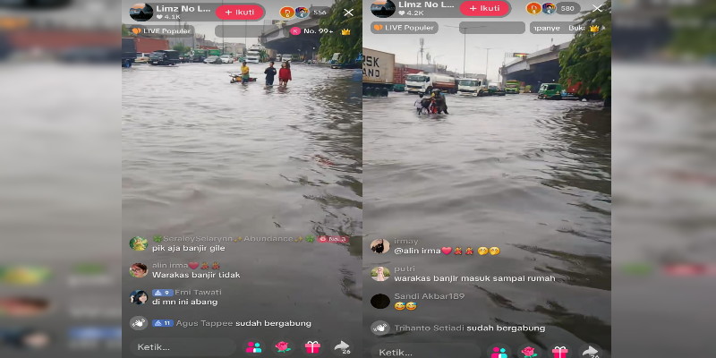 Warga Sunter Jaya, Jakarta Utara, melaporkan kondisi terkini melalui siaran langsung di platform media sosial TikTok. Pemilik akun Limz No Limit menunjukkan banjir yang menggenangi perempatan Sunter Jaya.