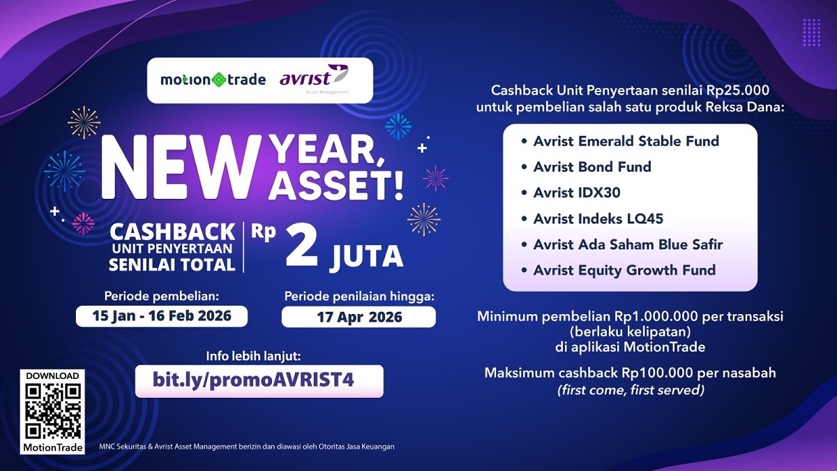 JAKARTA – Avrist Asset Management berkolaborasi dengan MNC Sekuritas menghadirkan promo “New Year, New Asset” di aplikasi online trading MotionTrade. Total bonus cashback dari promo ini mencapai hingga Rp2.000.000.