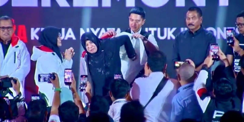 Ketua Umum PSI Kaesang Pangarep menyematkan jaket PSI kepada para kader baru sebagai simbol resmi masuknya para tokoh tersebut ke dalam barisan PSI.