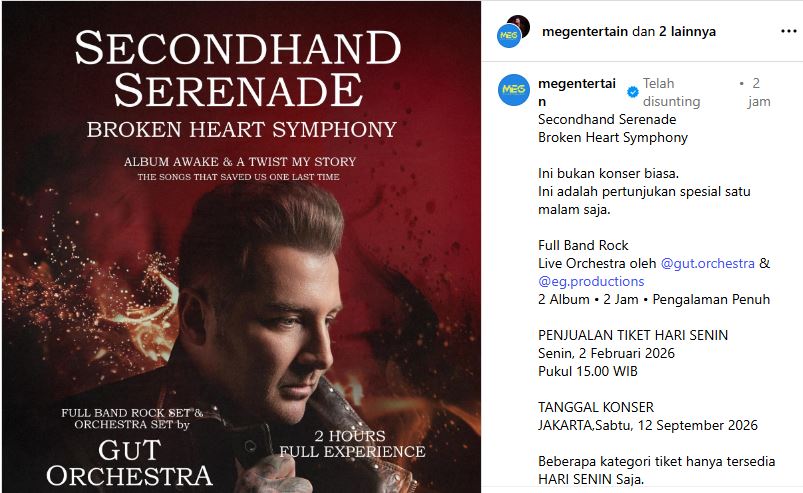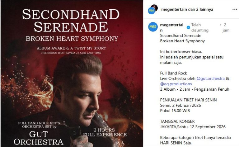 JAKARTA – Kabar gembira bagi penggemar musik rock. Secondhand Serenade siap menggelar konsernya di Jakarta bertajuk Broken Heart Symphony pada 12 September 2026. Konser tunggal yang digawangi John Vesely ini juga akan dipandu grup orkestra Tanah Air, Gut Orchestra dan Erwin Gutawa Productions.