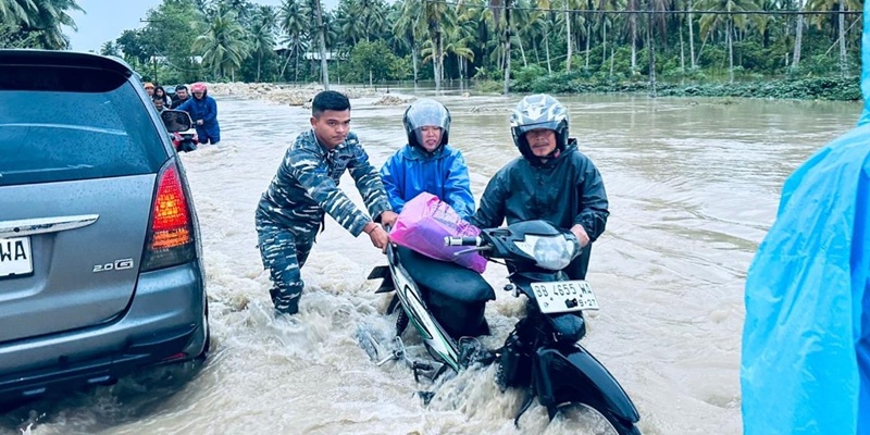 Prajurit TNI AL bergerak cepat membantu warga mendorong motor akibat melintasi jalan banjir disebabkan hujan deras yang mengguyur wilayah Nias Selatan sejak Rabu, 11 Februari 2026. Sejumlah ruas jalan utama terendam banjir dengan ketinggian air yang mencapai lutut hingga pinggang orang dewasa. Hal itu menyebabkan arus lalu lintas lumpuh dan menyulitkan aktivitas masyarakat, termasuk para pekerja, pelajar, serta pengguna jalan lainnya. (Foto: Dispenal)