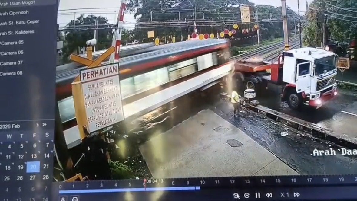 Berdasarkan rekaman yang diterima pada Jumat (20/2/2026), tampak truk kontainer berwarna putih hendak melintasi rel menuju arah Daan Mogot.